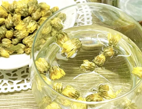 蓋をして数分蒸らすと、お湯が美しい黄金色に変わります。たったこれだけで、心と体を癒す菊花茶の完成です。